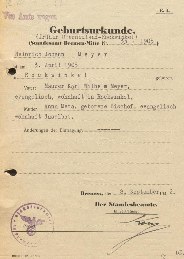 Johann war am 3. April 1905 als erstes Kind des Wilhelm Karl und Anna Meta Meyer, geborene Bischof, im Landgebiet Rockwinkel auf die Welt gekommen.